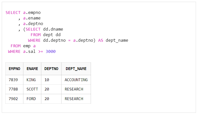 오라클에서 쿼리문을 작성하다 보면 서브 쿼리(subquery)를 자주 접하게 된다. 서브 쿼리를 처음 접하면 아주 복잡하게 느껴지는데, 기능을 조금만 익히면 쿼리문을 작성할 때 아주 유용하게 사용