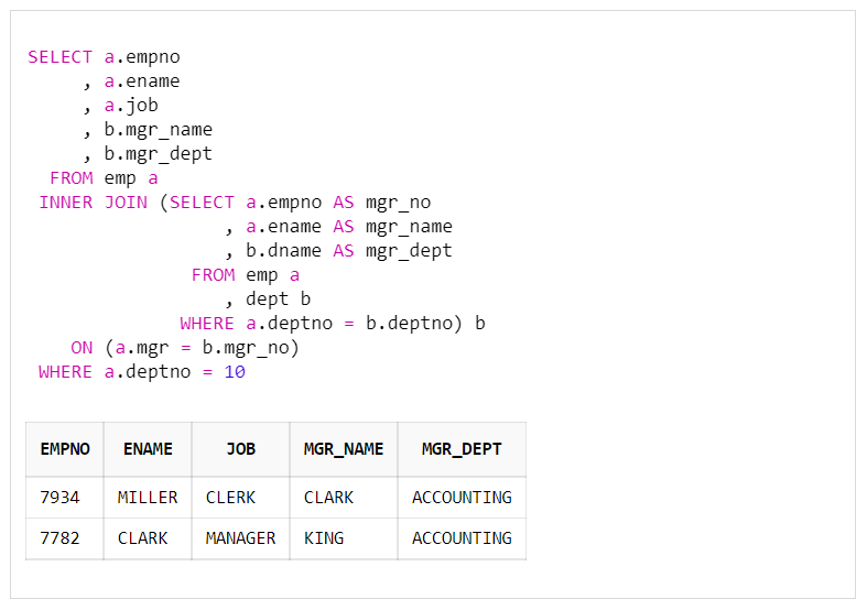 - 뷰(View) 형태로써 테이블을 리턴하는 서브쿼리 (FROM절에 사용)