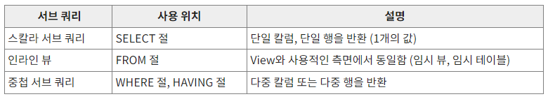 - 하나의 변수처럼 사용. 쿼리 결과에 따라 하기와 같이 구분 (WHERE절에 사용)