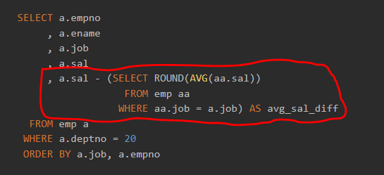- 메인 쿼리의 값을 사용하는 서브쿼리