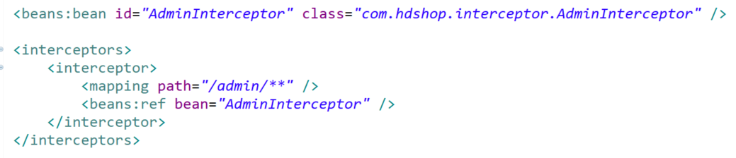 - 모든 요청을 가로채서( Interceptor ) com.hdshop.interceptor 패키지에 있는 AdminInterceptor 객체를 실행하겠다 는 의미입니다.