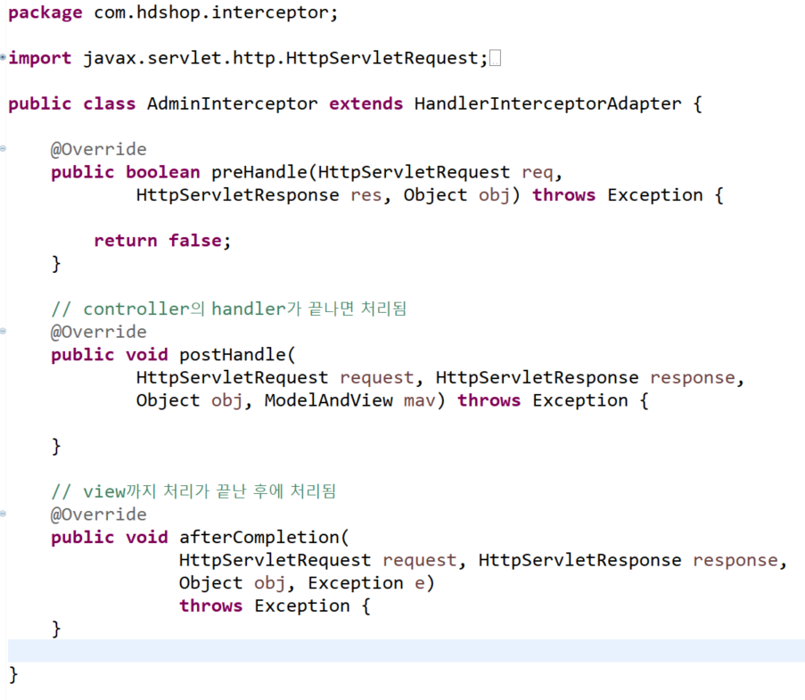 - 사실상 만약 아래와 같이 HandlerInterCeptorAdapter를 상속받는다면 사실상 postHandle, afterComplete 매서드를