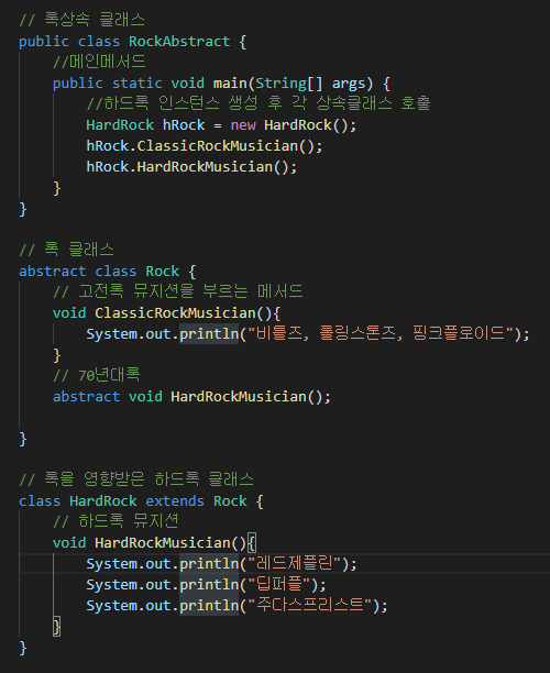 - 여러 메서드가 있지만 가져다 쓰거나 오버라이드 하거나, abstract가 붙은 메서드는 반드시 구현해
